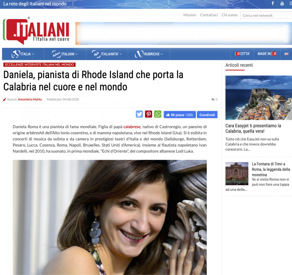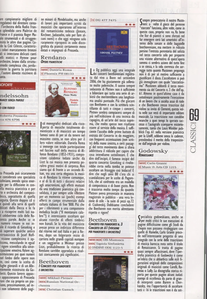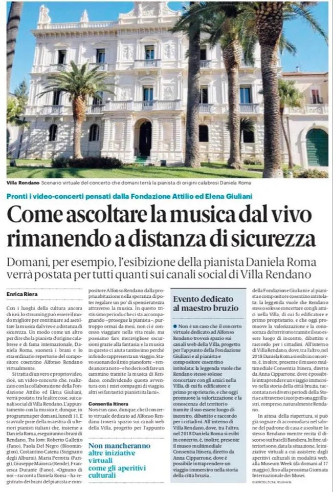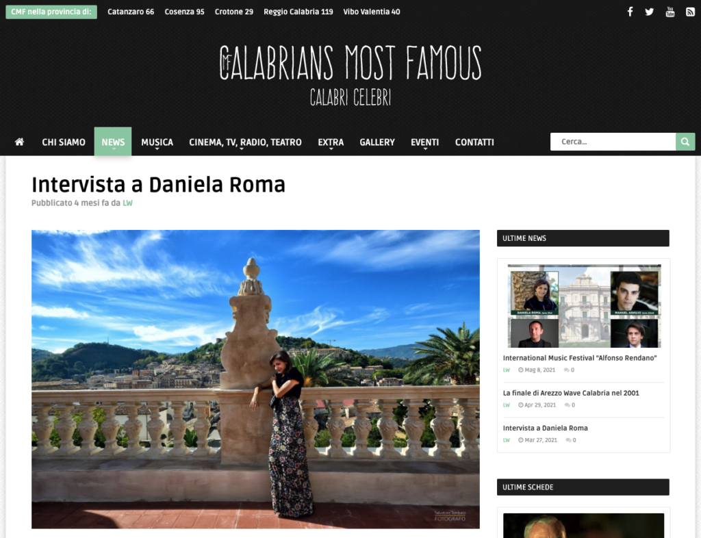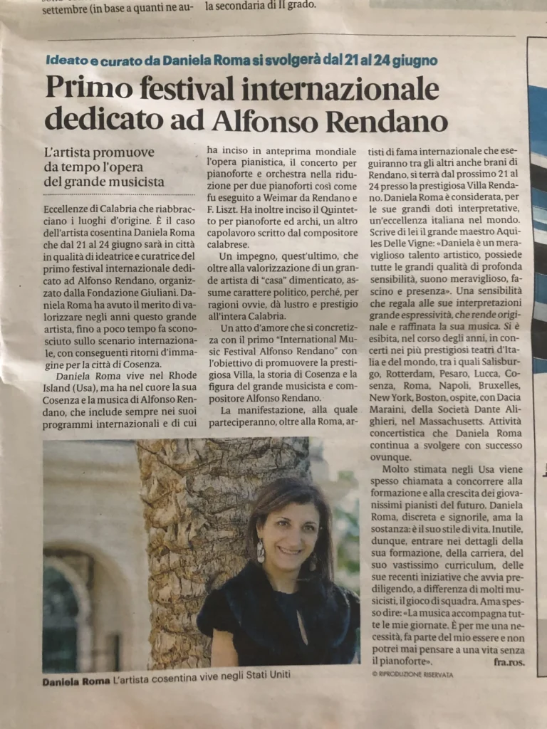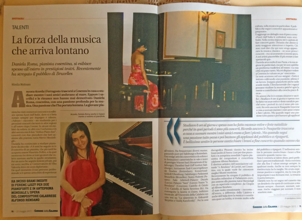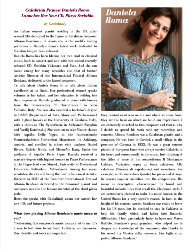(from the left): “Classic Voice”, Cd Alfonso Rendano Piano Works review; “Giornale di Calabria”, interview to Daniela Roma