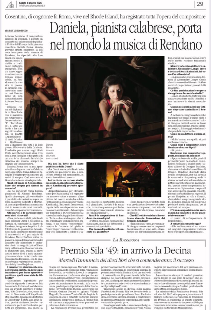 “Quotidiano del Sud” Newspaper (Italy), March 8, 2025, interview to Daniela Roma.
